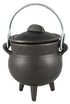 Description:Crafted of cast iron and standing on three small legs this cauldron comes a small handle on either side and a carrying handle. Made in a two part casting process; seams may be visable and rough on some cauldrons. 3" x 2 3/4"