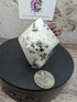 Rainbow Moonstone carved point/ cupcake. Approx 2.50 inch approx 4.70 ounce. Has a small spot or two of Blue flash.