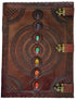A massive tome with three latches to keep it closed and a line of 7 Chakra stones running down the front over the simple mandala centered on the cover. Embossing at the edge and on the rear cover may vary. Size may vary slightly. 180 blank, handmade, linen parchment paper pages. 13 1/2" x 18", (made from goat leather). Latches show signs of oxidation.