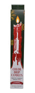 Color drip candles that are white and drips red. Makes a fascinating centerpiece for any occasion. Watch as the candle burns and the color cascades down the side. Set of 2 9 1/2" candles.